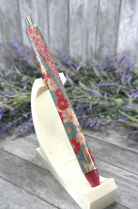 Handmade Red and Aqua flowers washi tape glitter pen with free refill