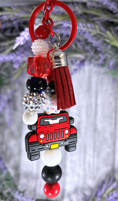 Handmade Red Truck Beaded Keychain With Clip and Keyring