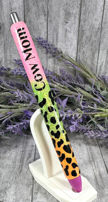 Wrapped Handmade Cow Mom Rainbow glitter pen with free refill
