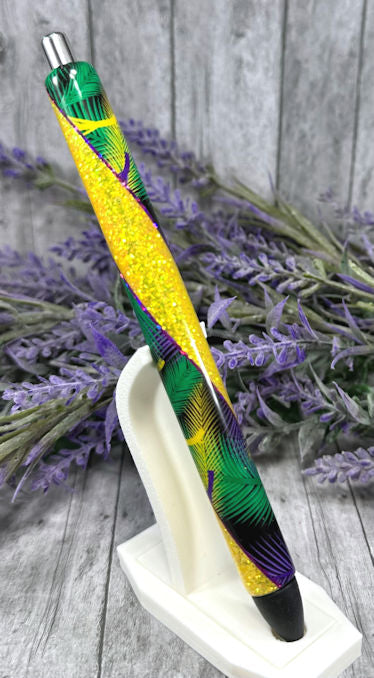Handmade Mardi Gras Feathers Washi Tape on Yellow glitter pen with free refill