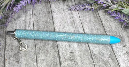 Handmade Seashell dangle charm on aqua glitter pen with free refill