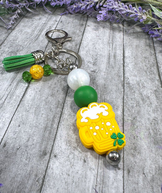 Handmade Beaded St Patricks Beer Keychain With Clip and Keyring