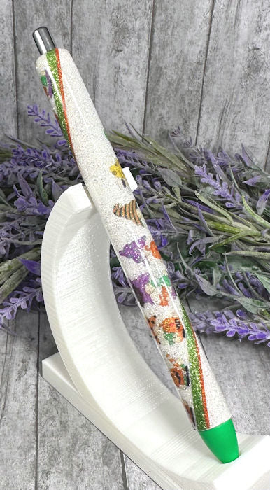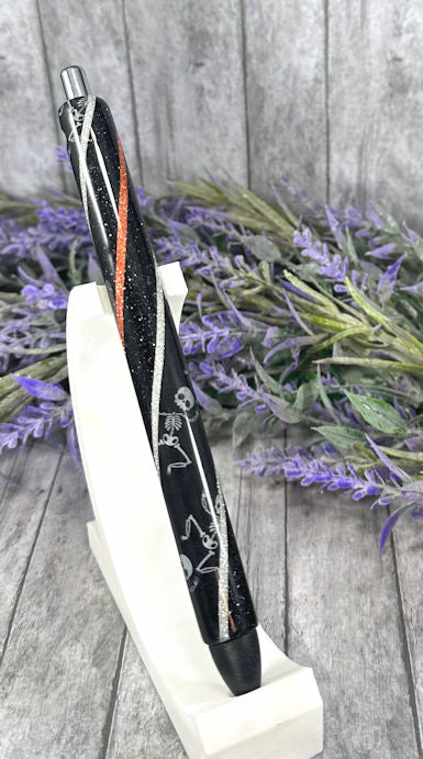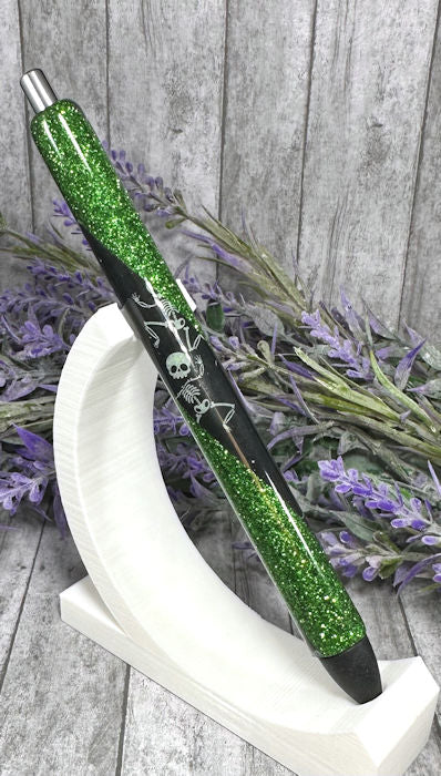 Handmade Halloween Skeletons on green glitter pen with free refill