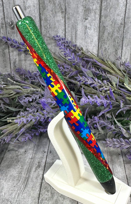 Handmade Autism Awareness Washi Tape on green glitter pen with free refill