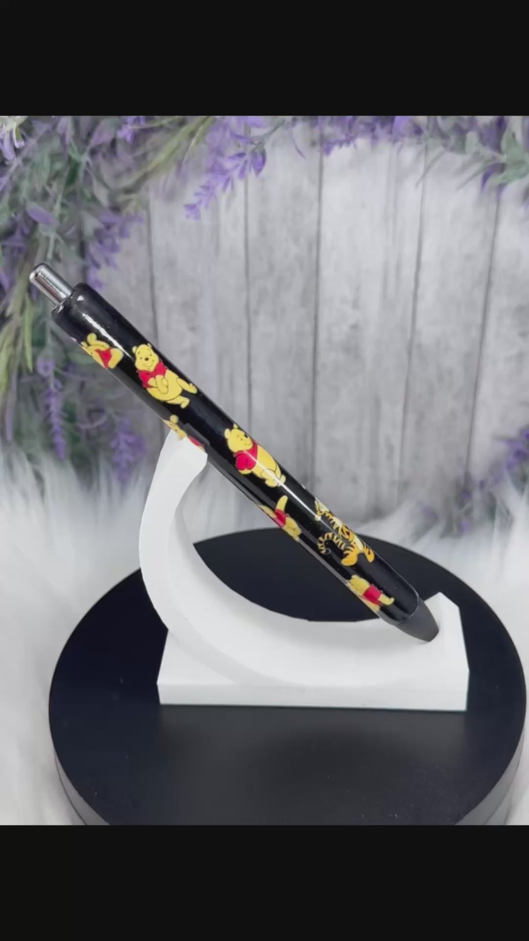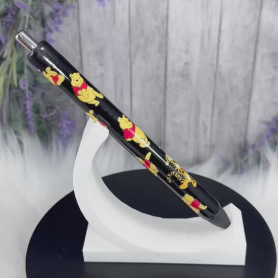 Handmade Baby Winnie the Pooh and Friends on black glitter pen with free refill