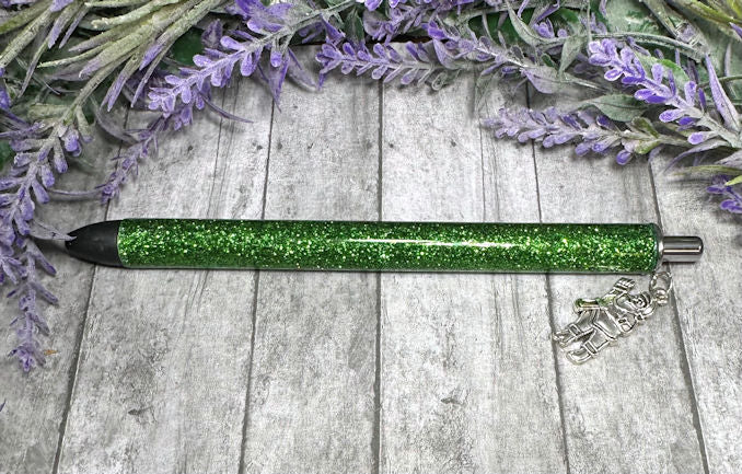 These dangle charm pens are handcrafted with glitter, vinyl and resin. The charms are glued into place with industrial glue, and a bead of resin on top for reinforcements!