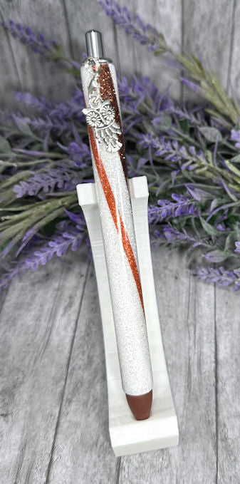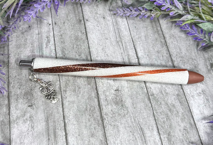 These dangle charm pens are handcrafted with glitter, vinyl and resin. The charms are glued into place with industrial glue, and a bead of resin on top for reinforcements!