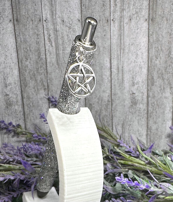These dangle charm pens are handcrafted with glitter, vinyl and resin. The charms are glued into place with industrial glue, and a bead of resin on top for reinforcements!