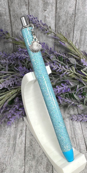 Handmade Seashell dangle charm on aqua glitter pen with free refill