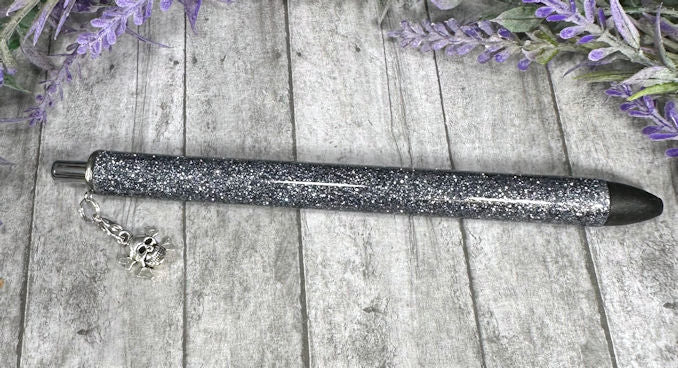 These dangle charm pens are handcrafted with glitter, vinyl and resin. The charms are glued into place with industrial glue, and a bead of resin on top for reinforcements!